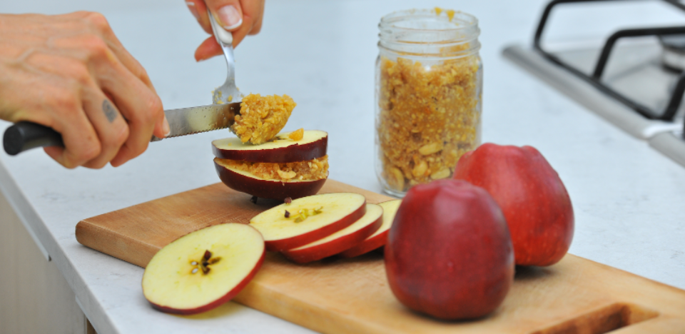 Erdnüsse haben einen hohen Proteinanteil und schmecken in Kombination mit einem süss-sauren Apfel einfach hervorragend. Wenn Sie Erdnüsse nicht mögen, können sie stattdessen auch Haselnüsse oder Pistazien verwenden.