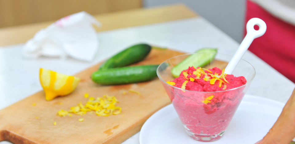 Wenn Sie die Kichererbsen am Vorabend einlesen, sind sie im Dampfkochtopf im Nu gekocht. Nach dem Abkühlen beginnt die etwas mühselige Arbeit. Die Hülle muss nämlich entfernt werden. Man kann aber auch eingelegte Kichererbsen kaufen, dann entfällt dieser Aufwand. Die Rande weichkochen und mit den übrigen Zutaten in den Mixer geben. Vor dem Servieren können Sie ein paar Tropfen Olivenöl über den Humus träufeln, die Gurken schälen und in Stäbchenform schneiden.