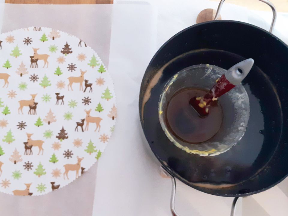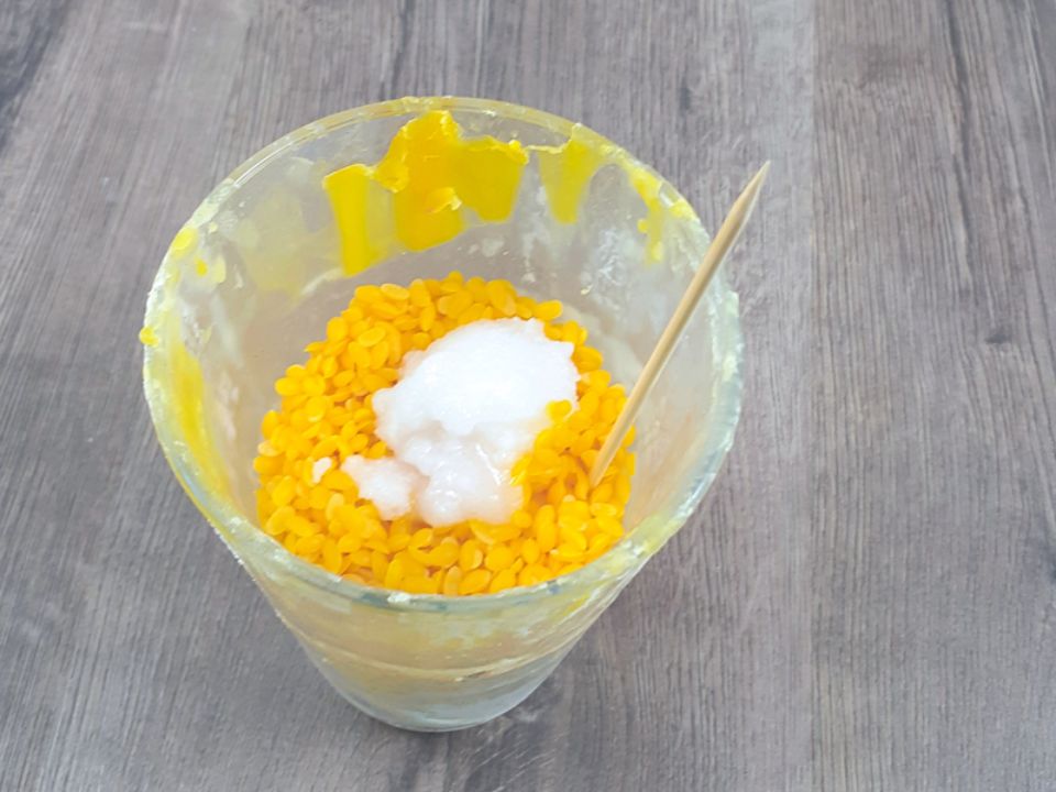 Schmelzt das Bienenwachs mit dem Kokosöl in einem grossen Glas (Wasserbad).