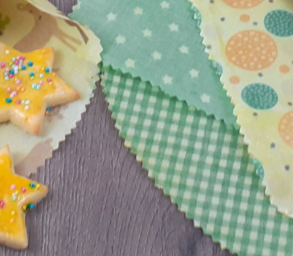 Den vorbereiteten Baumwollstoff auf das Backpapier legen und das Bienenwachs schnell von der Mitte aus mit dem Pinsel aufstreichen. Nicht zu viel Wachs nehmen. Ein zweites Stück Backpapier auf den Stoff mit dem Wachs legen.