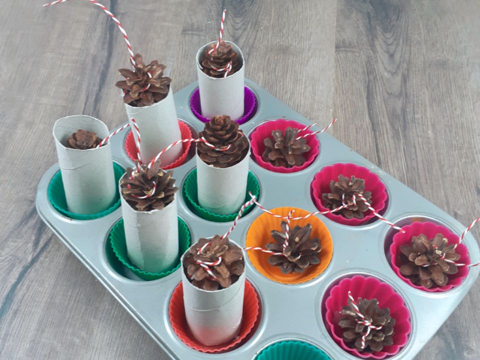 Silikon-Muffinformen vorbereiten. Holzspäne und Tannenzapfen in die Muffinformen füllen. Flüssiges Wachs in die Muffinformen giessen.