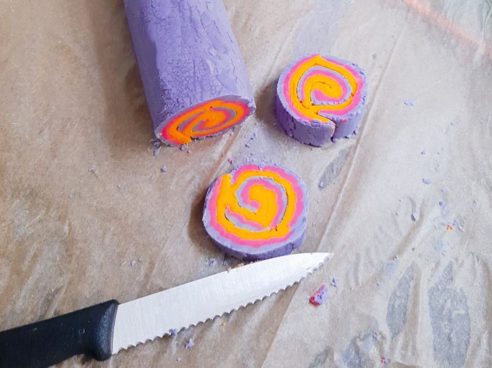 - Jetzt die Rolle vorsichtig in Stücke schneiden