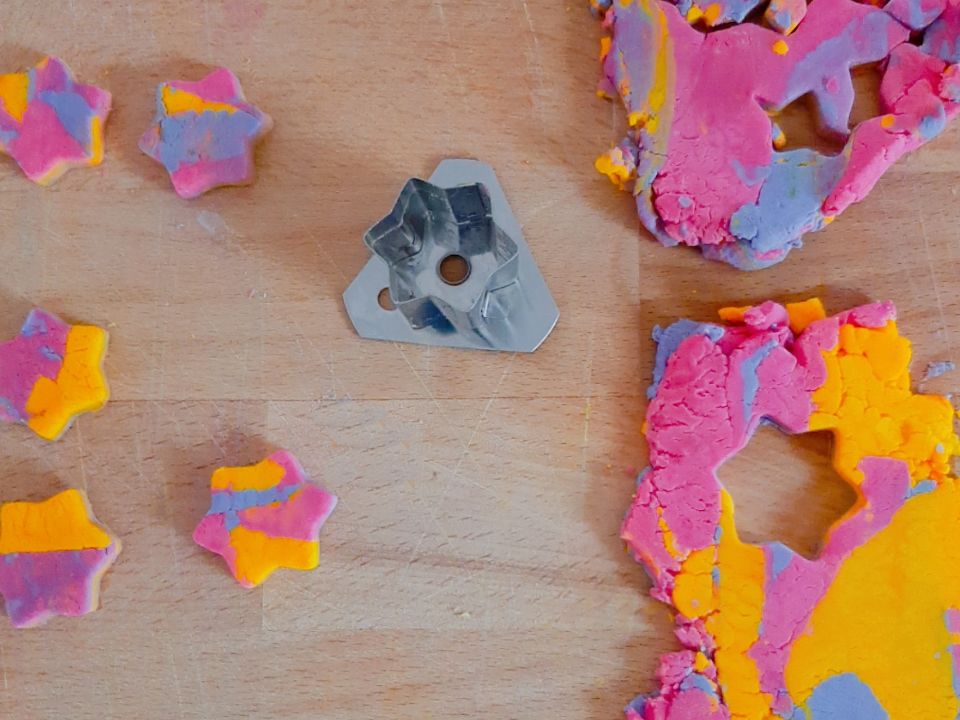 Die ausgerollte Masse oder restlichen Teig mit Ausstechformen ausstechen oder marmorierten Teig in Silikon Eisformenbehälter, Muffinbleche etc. drücken und rauslösen.