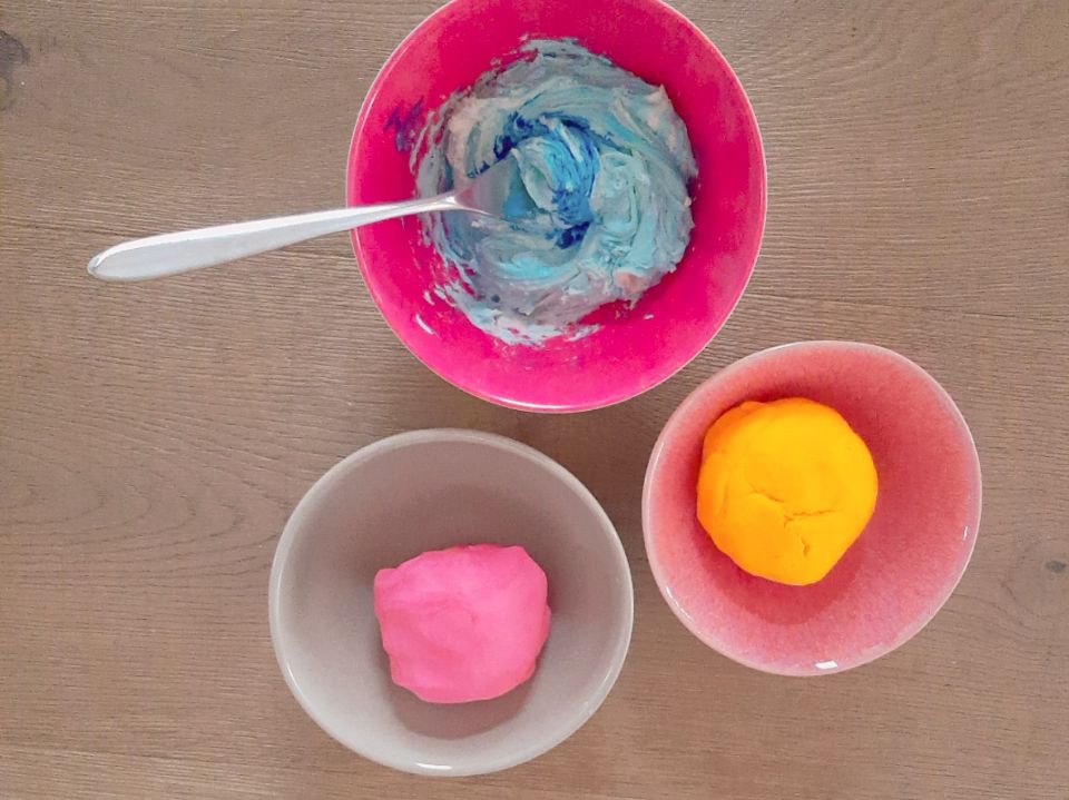 - Teig in Schüsseln aufteilen und nach Wunsch Lebensmittelfarben einkneten.