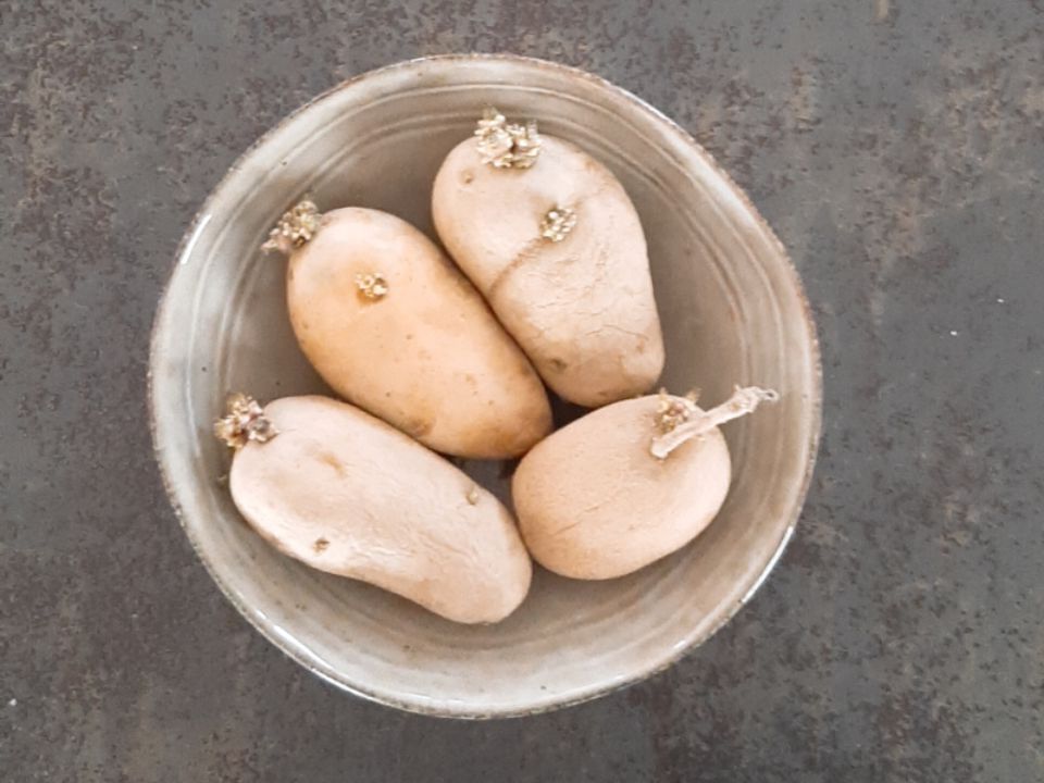 - Kartoffeln auf einer sonnigen Fensterbank auslegen und abwarten, bis sie mindestens 1 cm lange Keimlinge entwickeln.