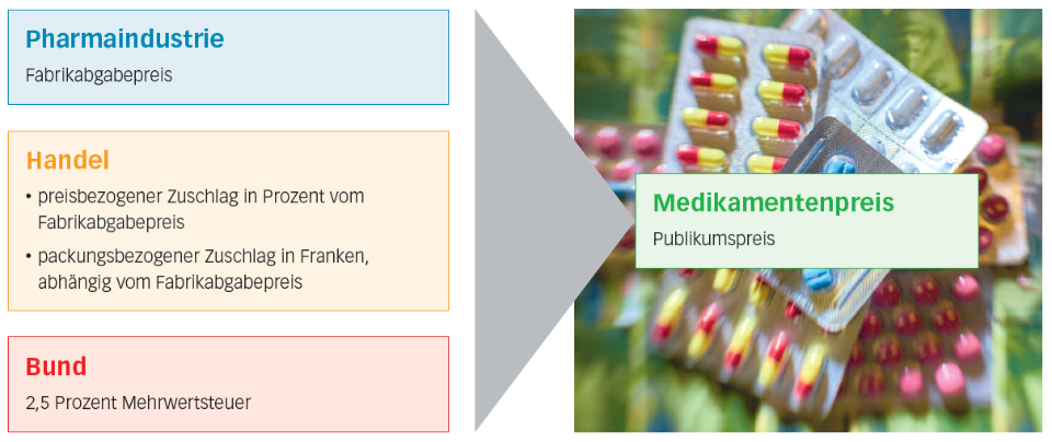 Der Verkaufspreis eines kassenpflichtigen Medikaments wird staatlich festgesetzt. Der Preis setzt sich zusammen aus den Vertriebskosten, dem Fabrikabgabepreis, der Verkaufsabgabe von maximal fünf Franken pro verkaufte Packung und der Mehrwertsteuer (2.5 Prozent). Bei Generika entfällt der Forschungsaufwand. Somit sind Generika 10 bis 60 Prozent günstiger als das Originalpräparat.