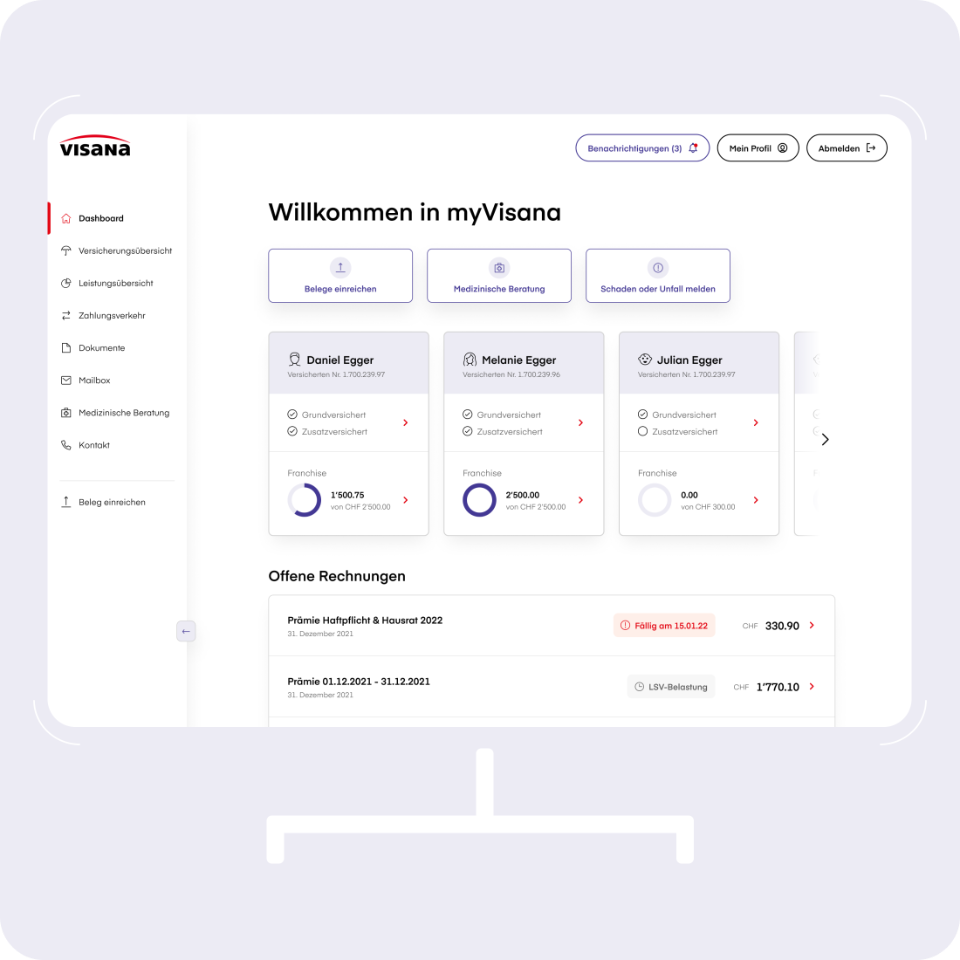 Dank dem Online-Kundenportal myVisana erledigen Sie alles rund um Ihre Versicherung wann und wo Sie wollen. Einfach und bequem am Computer oder via App am Smartphone.