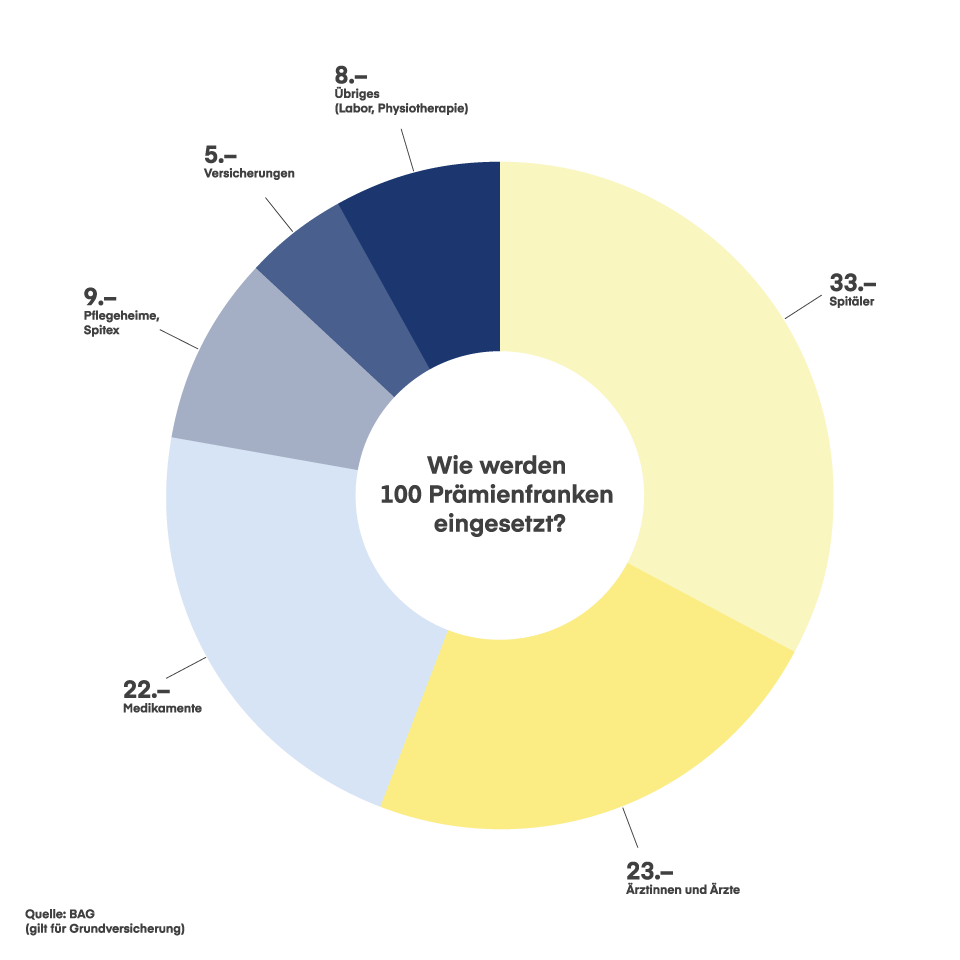 Haben Sie gewusst, dass 95 von 100 Prämienfranken der Grundversicherung für die Begleichung der Gesundheitskosten bei den Leistungserbringern wie Ärzte, Spitäler oder Therapeuten eingesetzt werden?
