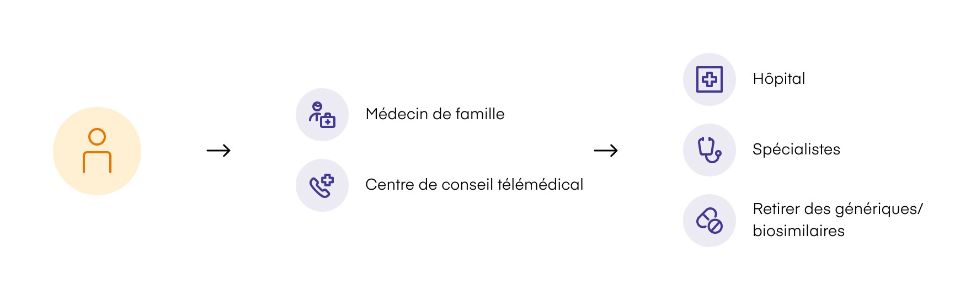 Pour toute question médicale, adressez-vous à Medi24 ou à votre médecin de famille. Vous ne pouvez consulter d’autres fournisseurs de prestations (en particulier des spécialistes) que sur délégation de Medi24 ou de votre médecin de famille.