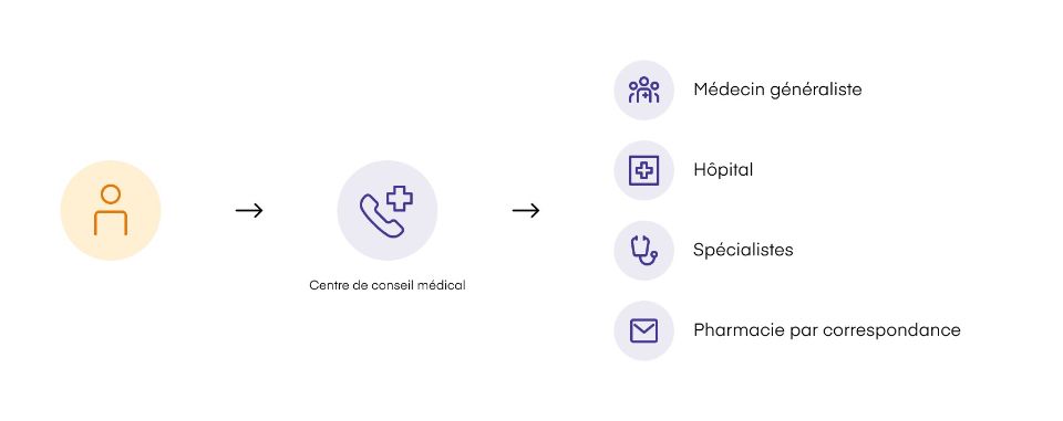Avec Tel Doc, vous appelez le centre de conseil médical Medi24 avant de vous rendre chez le médecin, en cas de problèmes de santé. Un/e spécialiste de Medi24 vous orientera, si nécessaire, vers un/e généraliste ou un hôpital. Contrairement à Med Call, vous êtes ici tenu/e de suivre les instructions reçues.
