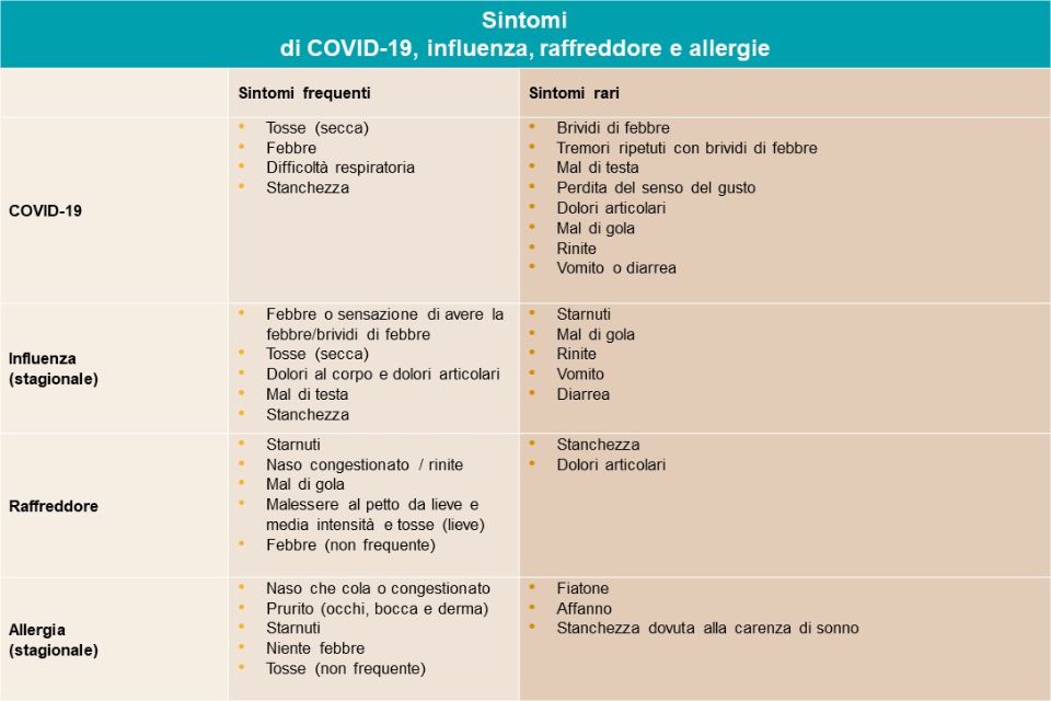 Anche la perdita di gusto, di norma, è da ricondurre al coronavirus. Il naso che cola o gli occhi che lacrimano sono, invece, sintomi frequenti di allergie o raffreddore. Inoltre, i sintomi da allergia migliorano tendenzialmente con l’assunzione di antistaminici e altri farmaci specifici per le allergie.