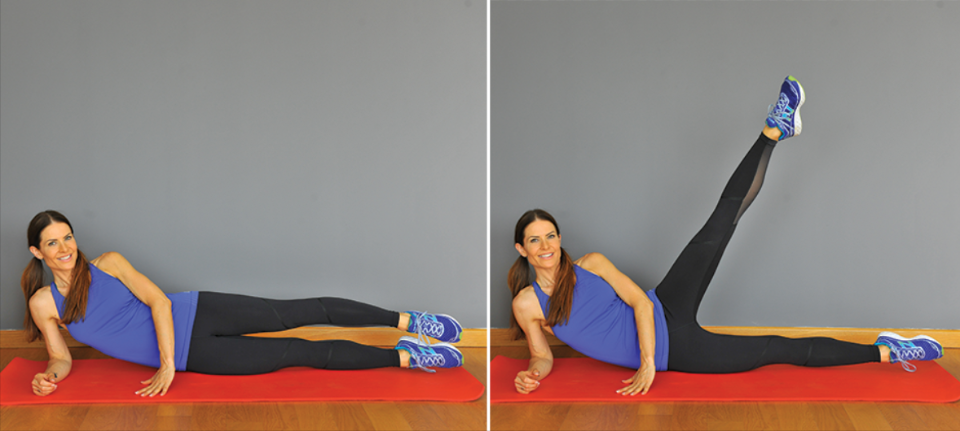 Sdraiatevi lateralmente su un tappetino di yoga e allungate la gamba destra sul pavimento; appoggiate la gamba sinistra su quella destra e mantenete questa posizione sostenendovi anche con il gomito destro. Ora sollevate la gamba sinistra tenendola allungata, alzandola il più in alto possibile; mantenete la contrazione per 1–2 secondi, prima di abbassare la gamba e ripetere l’esercizio.