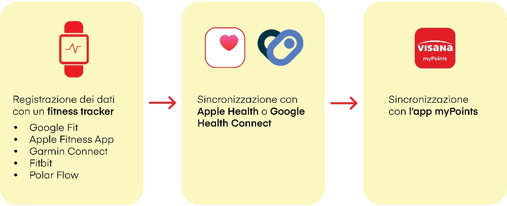 In un primo momento Apple Health e altri tracker continueranno a essere disponibili nella versione attuale di Visana App e saranno integrati nella nuova app myPoints in un momento successivo.